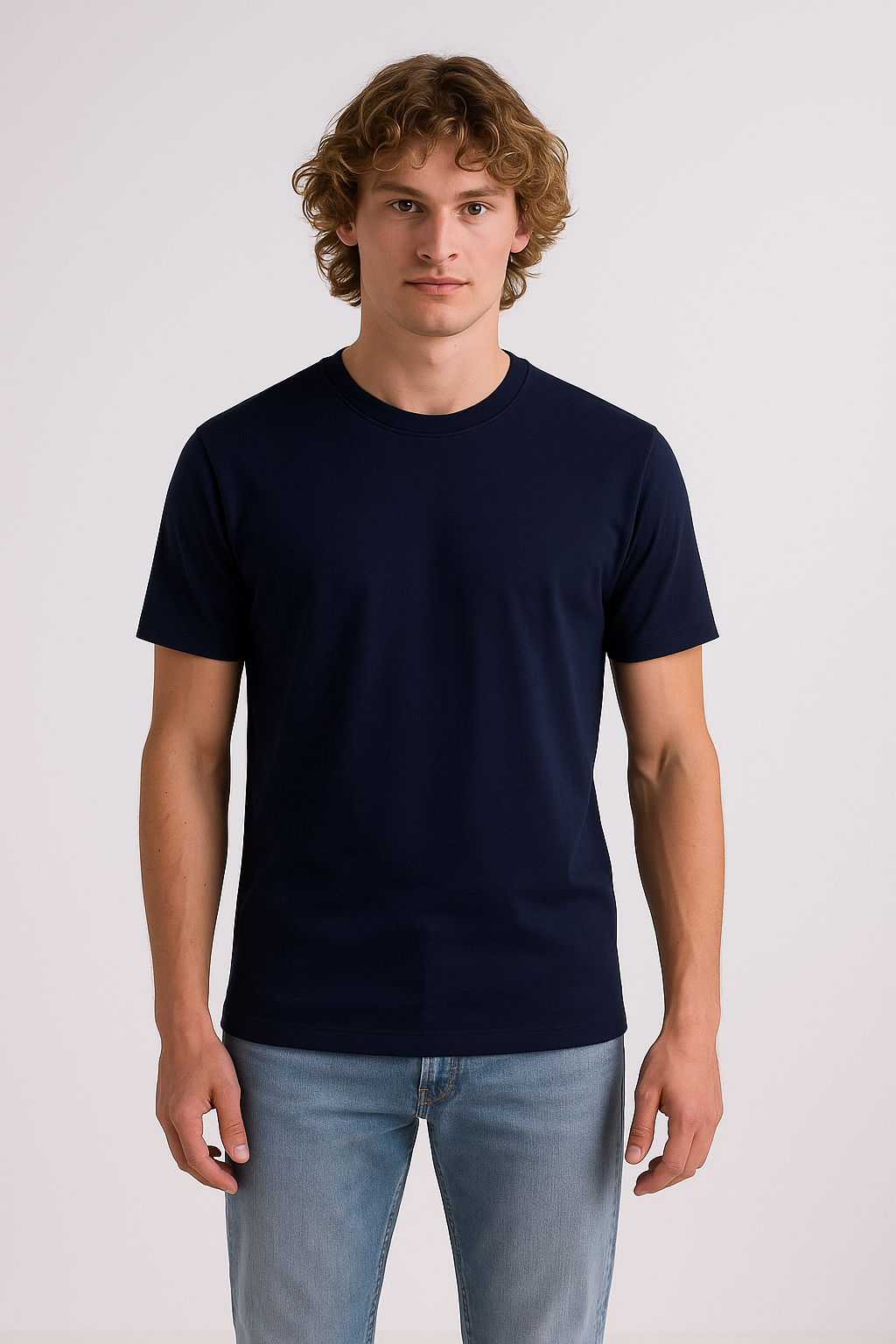 Upgrade your everyday wardrobe with the Navy Blue Round Neck Cotton T-Shirt for Men, crafted for all-day comfort and lasting durability. Made from premium CVC blend cotton fabric (60% cotton, 40% polyester), this t-shirt delivers a soft, breathable feel with enhanced strength and shape retention, making it perfect for daily wear.